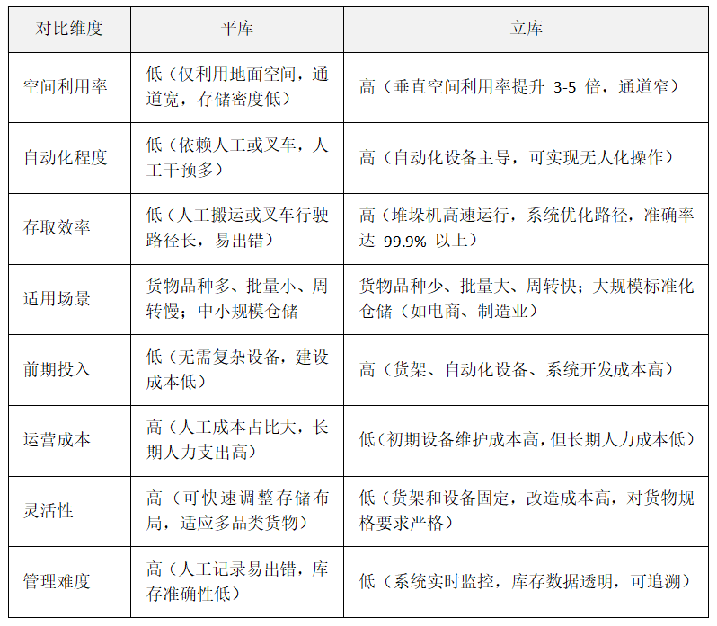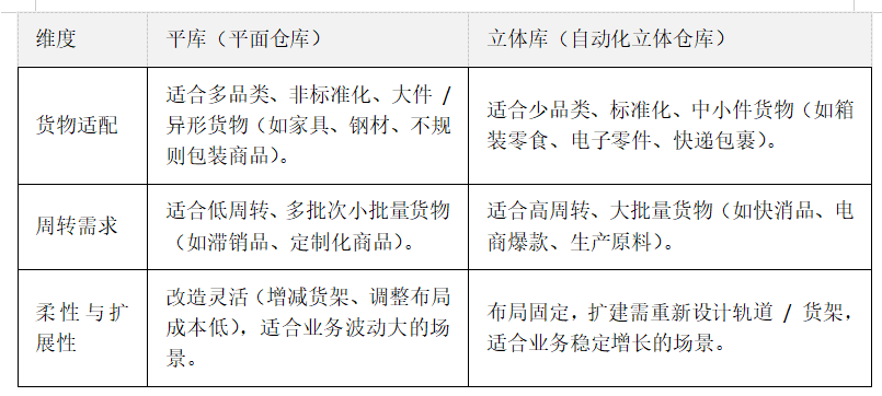 新倉庫選擇平庫還是立體庫,需結(jié)合貨物特性、業(yè)務(wù)規(guī)模、周轉(zhuǎn)效率、成本預(yù)算等核心因素綜合判斷。兩者的適用場景差異顯著,以下從關(guān)鍵維度對比分析,并提供決策思路: